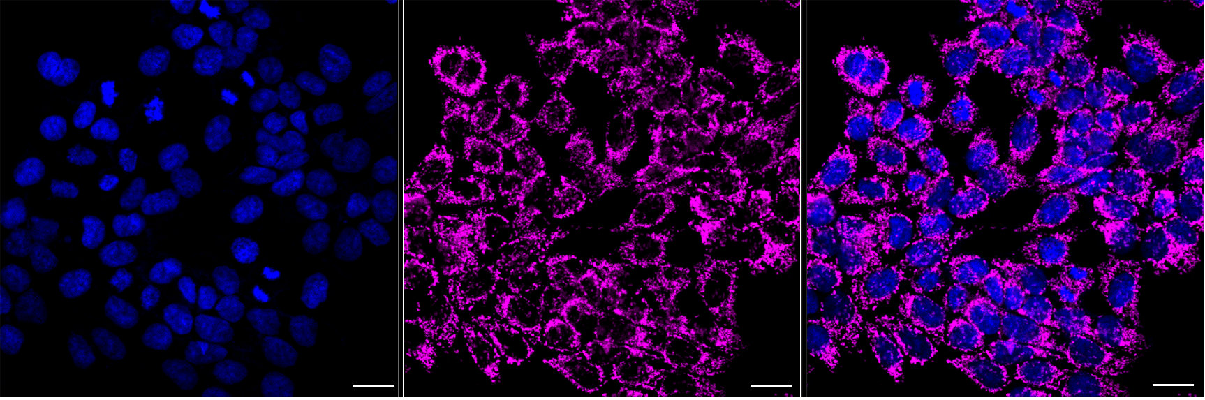 Immunocytochemical staining of HAP1 cells with CYP7B1 antibody. Nuclei were stained blue with DAPI; CYP7B1 stained magenta with Alexa Fluor? 647. Images were taken using Leica stellaris 5. Protein abundance based on laser Intensity and smart gain: High. Scale bar, 20 μm.