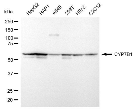 Western blotting analysis using CYP7B1 antibody. Total cell lysates (30 μg) from various cell lines were loaded and separated by SDS-PAGE. The blot was incubated with CYP7B1 antibody and HRP-conjugated goat anti-mouse secondary antibody respectively.