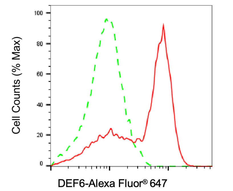Flow cytometric analysis of DEF6 expression in Jurkat cells using DEF6 antibody. Green, isotype control; red, DEF6.