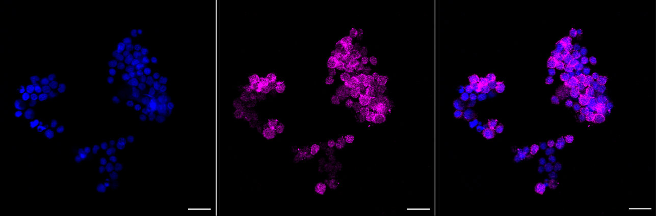 Immunocytochemical staining of Jurkat cells with DEF6 antibody. Nuclei were stained blue with DAPI; DEF6 was stained magenta with Alexa Fluor? 647. Images were taken using Leica stellaris 5. Protein abundance based on laser Intensity and smart gain: Medium. Scale bar, 20 μm.