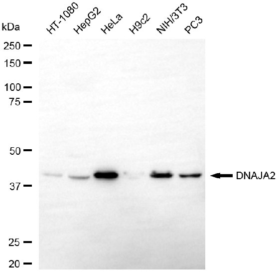Western blotting analysis using DNAJA2 antibody. Total cell lysates (30 μg) from various cell lines were loaded and separated by SDS-PAGE. The blot was incubated with DNAJA2 antibody and HRP-conjugated goat anti-mouse secondary antibody respectively.