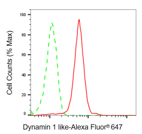 Flow cytometric analysis of Dynamin 1 like expression in HepG2 cells using Dynamin 1 like antibody. Green, isotype control; red, Dynamin 1 like.
