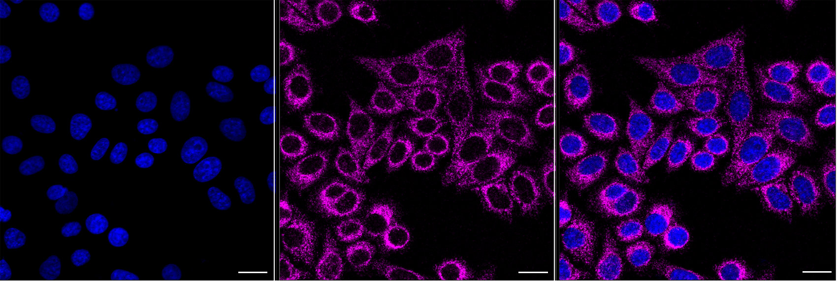 Immunocytochemical staining of HepG2 cells with Dynamin 1 like antibody. Nuclei were stained blue with DAPI; Dynamin 1 like was stained magenta with Alexa Fluor? 647. Images were taken using Leica stellaris 5. Protein abundance based on laser Intensity and smart gain: Medium. Scale bar, 20 μm.