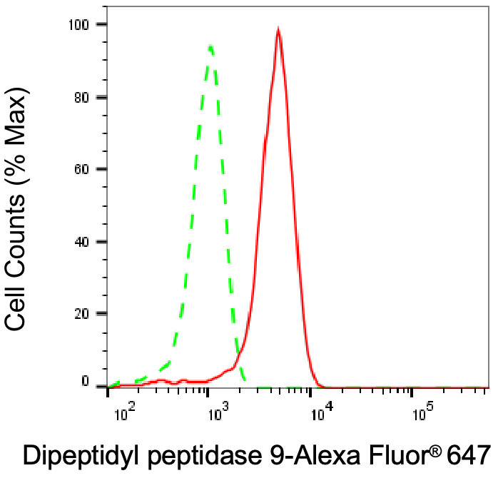 Flow cytometric analysis of Dipeptidyl peptidase 9 expression in HepG2 cells using Dipeptidyl peptidase 9 antibody. Green, isotype control; red, Dipeptidyl peptidase 9.
