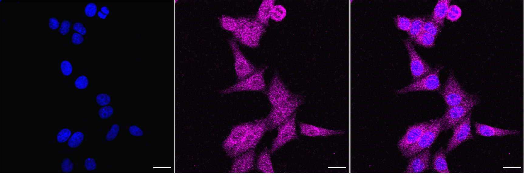 Immunocytochemical staining of HepG2 cells with Dipeptidyl peptidase 9 antibody. Nuclei were stained blue with DAPI; Dipeptidyl peptidase 9 was stained magenta with Alexa Fluor? 647. Images were taken using Leica stellaris 5. Protein abundance based on laser Intensity and smart gain: Low. Scale bar, 20 μm.