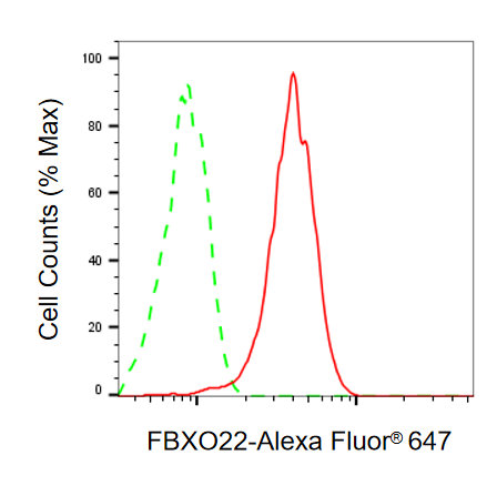Flow cytometric analysis of FBXO22 expression in HeLa cells using FBXO22 antibody. Green, isotype control; red, FBXO22.