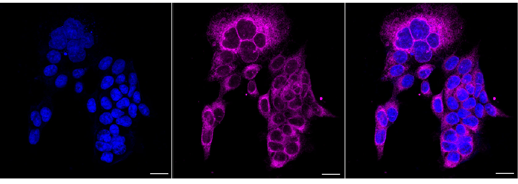 Immunocytochemical staining of HAP-1 cells with Farnesyl-diphosphate farnesyltransferase 1 antibody. Nuclei were stained blue with DAPI; Farnesyl-diphosphate farnesyltransferase 1 was stained magenta with Alexa Fluor? 647. Images were taken using Leica stellaris 5. Protein abundance based on laser Intensity and smart gain: Medium. Scale bar, 20 μm.
