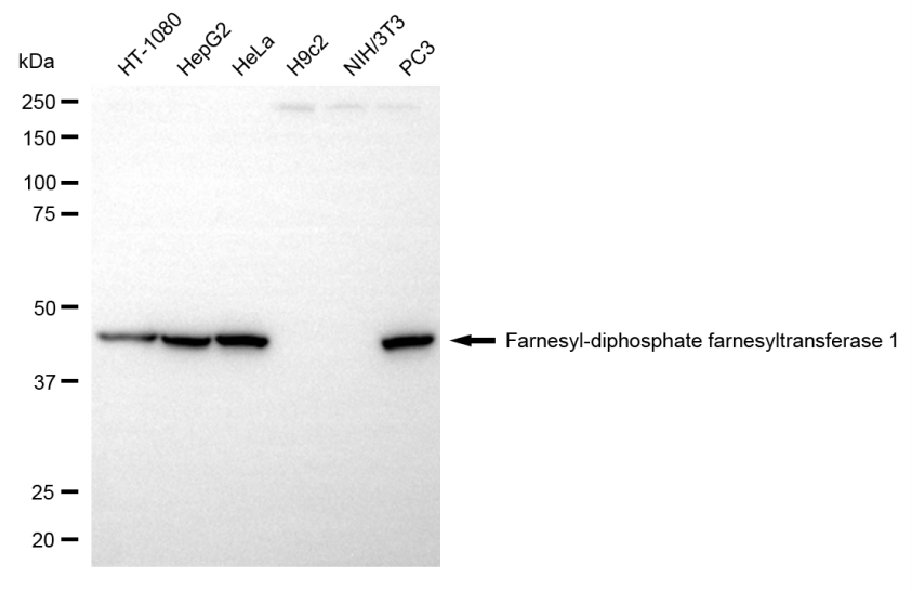 Western blotting analysis using farnesyl-diphosphate farnesyltransferase 1 antibody. Total cell lysates (30 μg) from various cell lines were loaded and separated by SDS-PAGE. The blot was incubated with farnesyl-diphosphate farnesyltransferase 1 antibody and HRP-conjugated goat anti-mouse secondary antibody respectively.