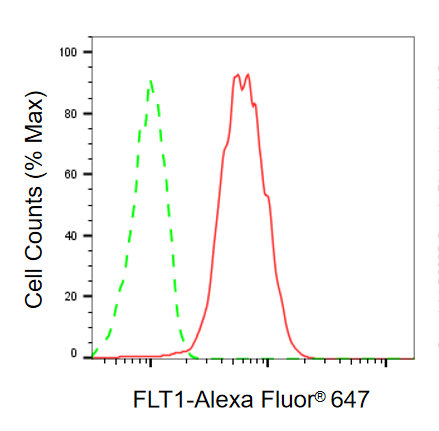 Flow cytometric analysis of FLT1 expression in HepG2 cells using FLT1 antibody. Green, isotype control; red, FLT1.