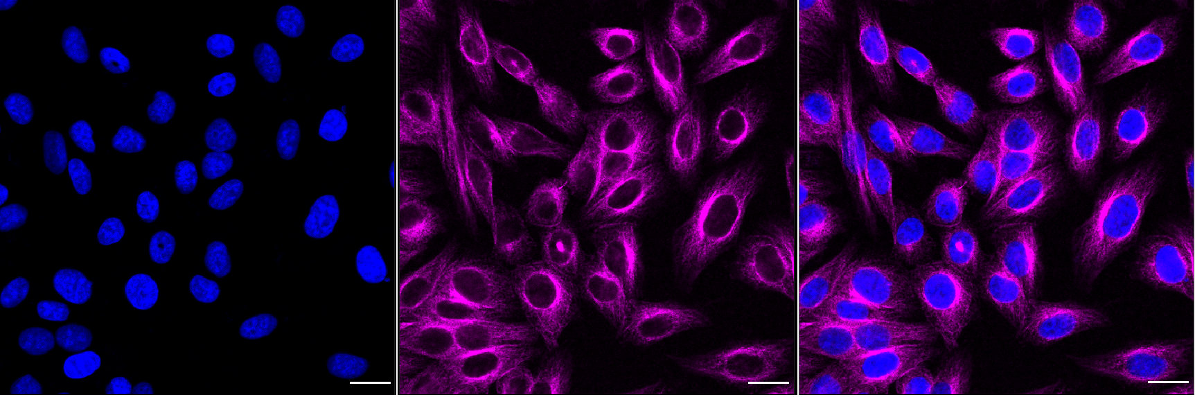 Immunocytochemical staining of HepG2 cells with FLT1 antibody. Nuclei were stained blue with DAPI; FLT1 was stained magenta with Alexa Fluor? 647. Images were taken using Leica stellaris 5. Protein abundance based on laser Intensity and smart gain: Medium. Scale bar, 20 μm.