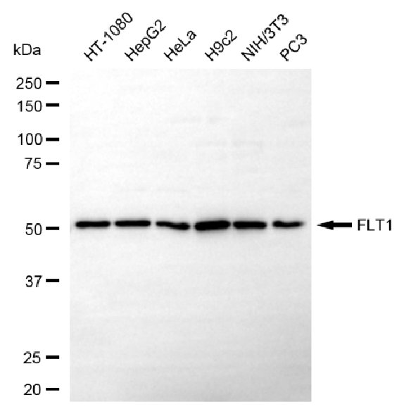 Western blotting analysis using FLT1 antibody. Total cell lysates (30 μg) from various cell lines were loaded and separated by SDS-PAGE. The blot was incubated with FLT1 antibody and HRP-conjugated goat anti-mouse secondary antibody respectively.