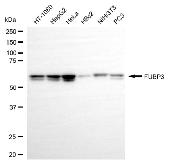 Western blotting analysis using FUBP3 antibody. Total cell lysates (30 μg) from various cell lines were loaded and separated by SDS-PAGE. The blot was incubated with FUBP3 antibody and HRP-conjugated goat mouse secondary antibody respectively.
