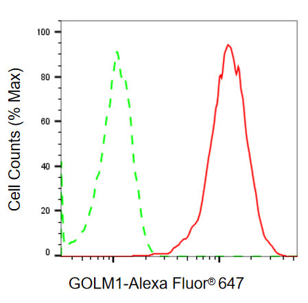 Flow cytometric analysis of GOLM1 expression in HepG2 cells using GOLM1 antibody. Green, isotype control; red, GOLM1.