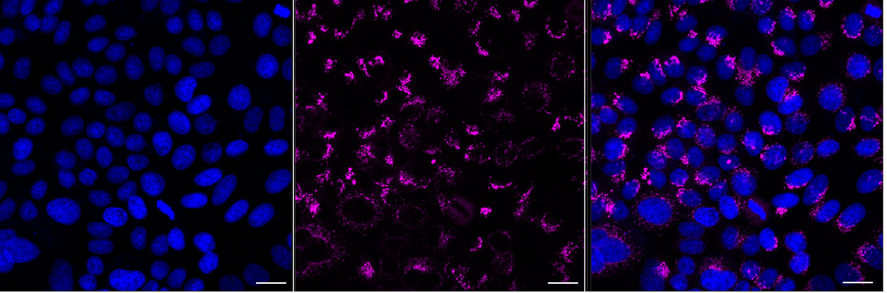 Immunocytochemical staining of HepG2 cells with GOLM1 antibody. Nuclei were stained blue with DAPI; GOLM1 was stained magenta with Alexa Fluor? 647. Images were taken using Leica stellaris 5. Protein abundance based on laser Intensity and smart gain: High. Scale bar, 20 μm.