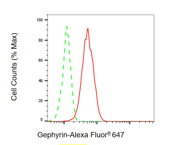 Flow cytometric analysis of Gephyrin expression in HAP-1 cells using Gephyrin antibody. Green, isotype control; red, Gephyrin.