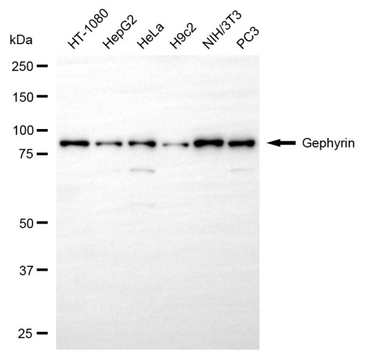 Western blotting analysis using gephyrin antibody. Total cell lysates (30 μg) from various cell lines were loaded and separated by SDS-PAGE. The blot was incubated with gephyrin antibody and HRP-conjugated goat anti-rabbit secondary antibody respectively.