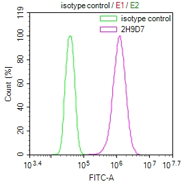 Overlay Peak curve showing Hela cells stained with CSB-MA009982A1m (red line) at 1:100. The cells were incubated in 10% normal goat serum to block non-specific protein-protein interactions followed by the antibody (1μg/1*106cells) for 1h at 4°C. The secondary antibody used was FITC-conjugated Goat Anti-Mouse IgG(H+L) at 1/100 dilution for 30min at 4°C. Isotype control antibody (green line) was mouse IgG1 (1μg/1*106cells) used under the same conditions. Acquisition of >10,000 events was performed.