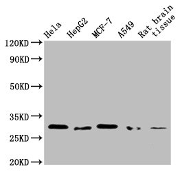 Positive WB detected in: Hela whole cell lysate, HepG2 whole cell lysate, MCF-7 whole cell lysate, A549 whole cell lysate, Rat brain tissue