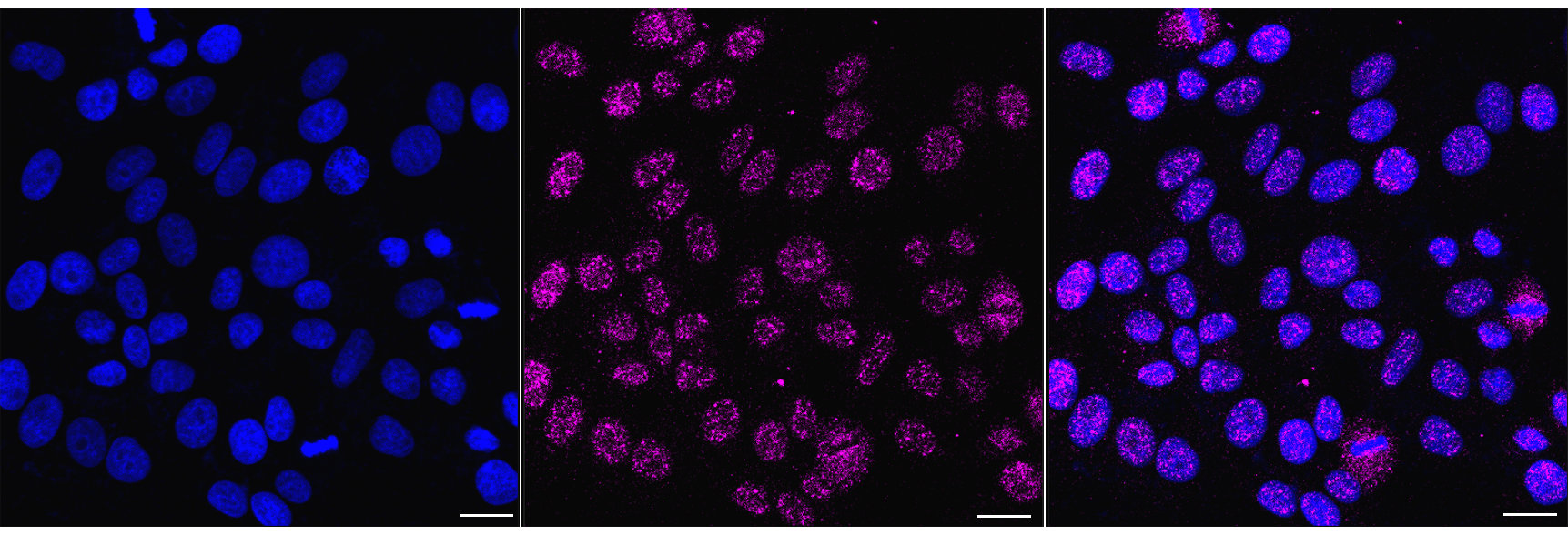 Immunocytochemical staining of C2C12 cells with HEXIM1 antibody. Nuclei were stained blue with DAPI; HEXIM1 was stained magenta with Alexa Fluor? 647. Images were taken using Leica stellaris 5. Protein abundance based on laser Intensity and smart gain: Low. Scale bar, 20 μm.
