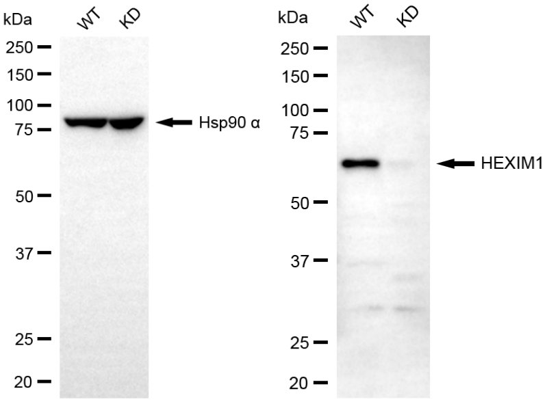 Western blotting analysis using HEXIM1 antibody. HEXIM1 expression in wild-type (WT) and HEXIM1 knockdown (KD) HSHC cells with 20 μg of total cell lysates. Hsp90 α serves as a loading control. The blot was incubated with HEXIM1 antibody and HRP-conjugated goat anti-mouse secondary antibody respectively.