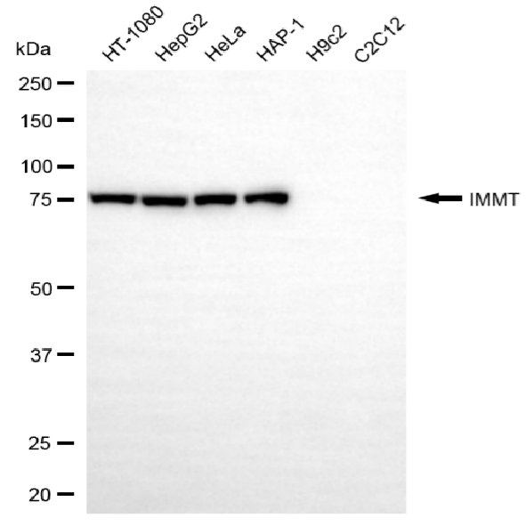 Western blotting analysis using IMMT antibody. Total cell lysates (30 μg) from various cell lines were loaded and separated by SDS-PAGE. The blot was incubated with IMMT antibody and HRP-conjugated goat anti-mouse secondary antibody respectively.