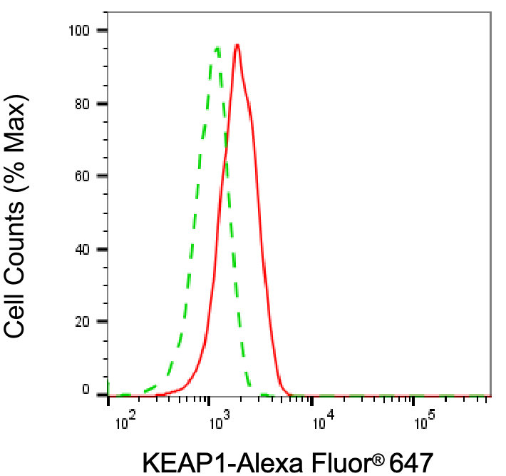 Flow cytometric analysis of KEAP1 expression in HAP-1 cells using KEAP1 antibody. Green, isotype control; red, KEAP1.