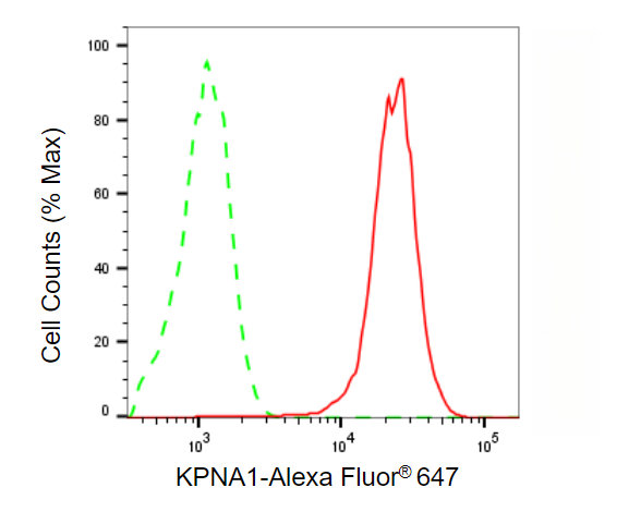Flow cytometric analysis of KPNA1 expression in HepG2 cells using KPNA1 antibody. Green, isotype control; red, KPNA1.