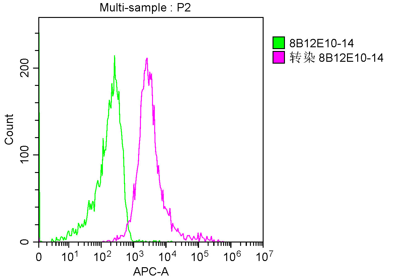 Overlay Peak curve showing A549 cells stained with CSB-MA012719A0m (red line) at 1:100. The cells were incubated in 10% normal goat serum to block non-specific protein-protein interactions followed by the antibody (1μg/1*106cells) for 1h at 4°C. The secondary antibody used was FITC-conjugated Goat Anti-Mouse IgG(H+L) at 1/100 dilution for 30min at 4°C. Isotype control antibody (green line) was mouse IgG1 (1μg/1*106cells) used under the same conditions. Acquisition of >10,000 events was performed.
