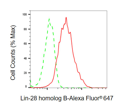 Flow cytometric analysis of Lin-28 homolog B expression in HAP-1 cells using Lin-28 homolog B antibody. Green, isotype control; red, Lin-28 homolog B.