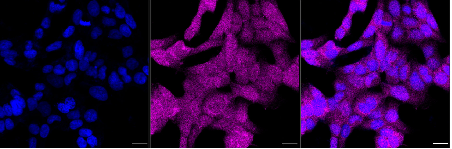 Immunocytochemical staining of HAP1 cells with Lin-28 homolog B antibody. Nuclei were stained blue with DAPI;Lin-28 homolog B was stained magenta with Alexa Fluor? 647. Images were taken using Leica stellaris 5. Protein abundance based on laser Intensity and smart gain: Medium. Scale bar, 20 μm.