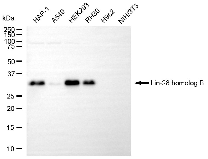 Western blotting analysis using lin-28 homolog B antibody. Total cell lysates (30 μg) from various cell lines were loaded and separated by SDS-PAGE. The blot was incubated with lin-28 homolog B antibody and HRP-conjugated goat anti-mouse secondary antibody respectively.