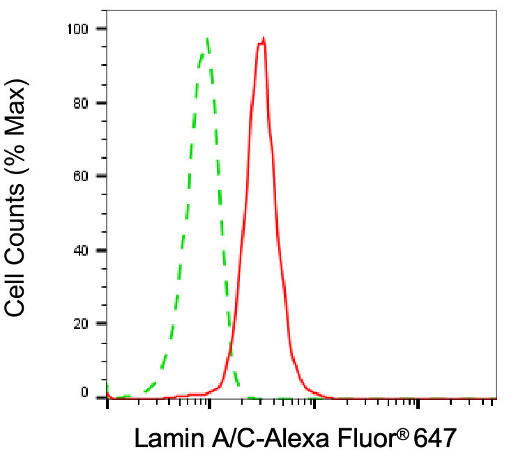 Flow cytometric analysis of Lamin A/C expression in HeLa cells using Lamin A/C antibody. Green, isotype control; red, Lamin A/C.