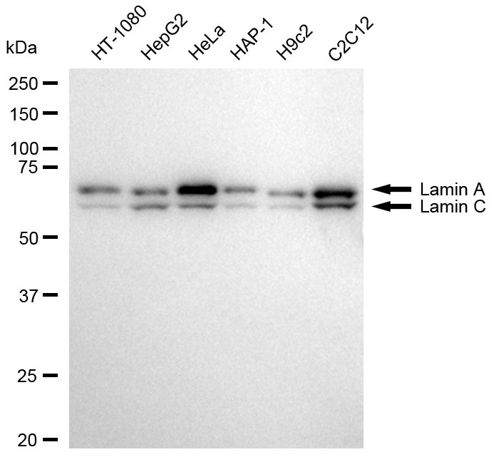 Western blotting analysis using Lamin A/C antibody. Total cell lysates (30 μg) from various cell lines were loaded and separated by SDS-PAGE. The blot was incubated with Lamin A/C antibody and HRP-conjugated goat anti-mouse secondary antibody respectively.