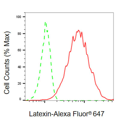 Flow cytometric analysis of Latexin expression in HepG2 cells using Latexin antibody. Green, isotype control; red, Latexin.