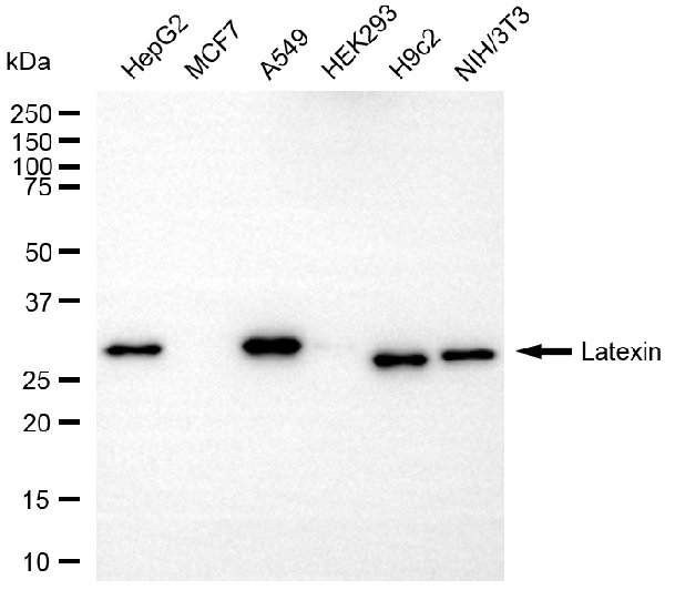 Western blotting analysis using latexin antibody. Total cell lysates (30 μg) from various cell lines were loaded and separated by SDS-PAGE. The blot was incubated with latexin antibody and HRP-conjugated goat mouse secondary antibody respectively.