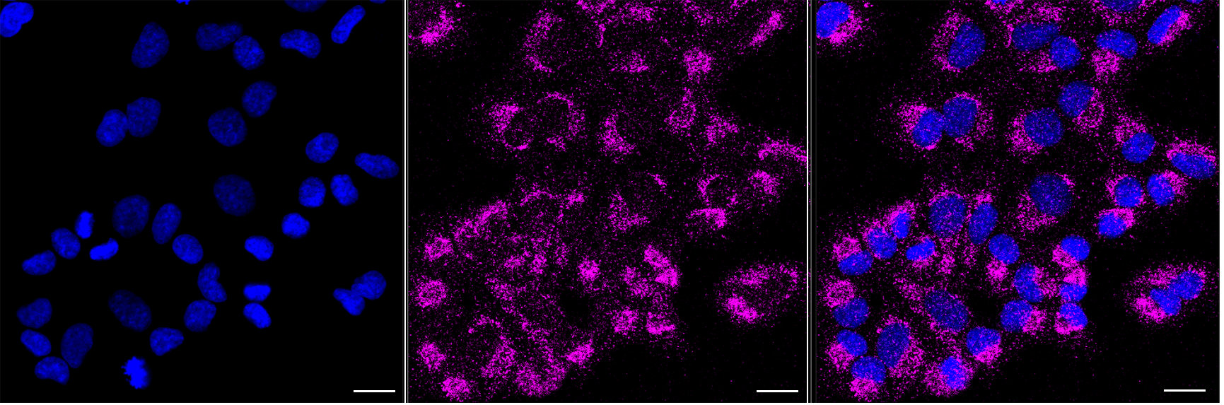 Immunocytochemical staining of HepG2 cells with MRPL11 antibody. Nuclei were stained blue with DAPI; MRPL11 was stained magenta with Alexa Fluor? 647. Images were taken using Leica stellaris 5. Protein abundance based on laser Intensity and smart gain: Low. Scale bar, 20 μm.