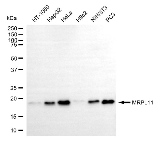 Western blotting analysis using MRPL11 antibody. Total cell lysates (30 μg) from various cell lines were loaded and separated by SDS-PAGE. The blot was incubated with MRPL11 antibody and HRP-conjugated goat mouse secondary antibody respectively.