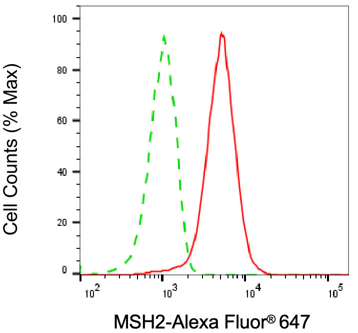 Flow cytometric analysis of MSH2 expression in HAP-1 cells using MSH2 antibody. Green, isotype control; red, MSH2.