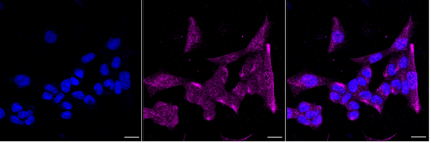 Immunocytochemical staining of HAP-1 cells with MSH2 antibody. Nuclei were stained blue with DAPI; MSH2 was stained magenta with Alexa Fluor? 647. Images were taken using Leica stellaris 5. Protein abundance based on laser Intensity and Smart Gain:Medium. Scale bar, 20 μm.