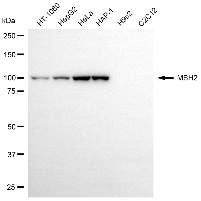 Western blotting analysis using MSH2 antibody. Total cell lysates (30 μg) from various cell lines were loaded and separated by SDS-PAGE. The blot was incubated with MSH2 antibody and HRP-conjugated goat anti-mouse secondary antibody respectively.
