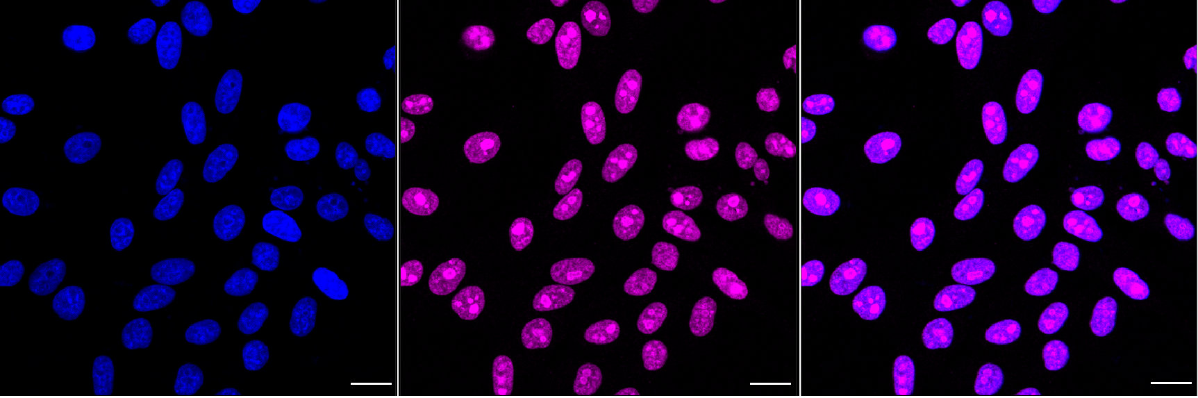 Immunocytochemical staining of HepG2 cells with MYB binding protein 1a antibody. Nuclei were stained blue with DAPI; MYB binding protein 1a was stained magenta with Alexa Fluor? 647. Images were taken using Leica stellaris 5. Protein abundance based on laser Intensity and smart gain: High. Scale bar, 20 μm.