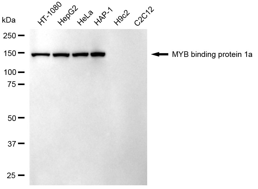Western blotting analysis using MYB binding protein 1a antibody. Total cell lysates (30 μg) from various cell lines were loaded and separated by SDS-PAGE. The blot was incubated with MYB binding protein 1a antibody and HRP-conjugated goat anti-mouse secondary antibody respectively.