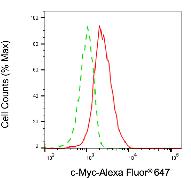 Flow cytometric analysis of c-Myc expression in HAP-1 cells using c-Myc antibody. Green, isotype control; red, c-Myc.