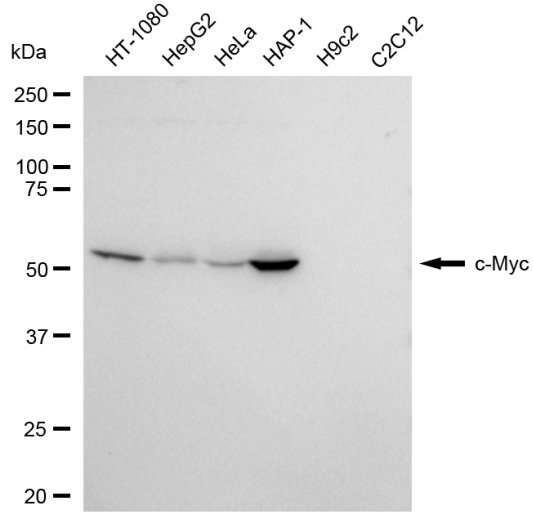 Western blotting analysis using c-Myc antibody. Total cell lysates (30 μg) from various cell lines were loaded and separated by SDS-PAGE. The blot was incubated with c-Myc antibody and HRP-conjugated goat anti-mouse secondary antibody respectively.