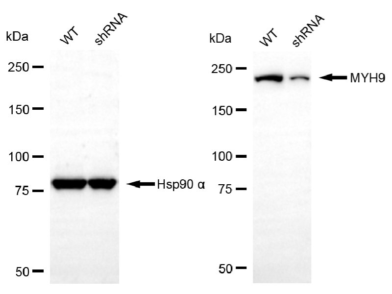Western blotting analysis using MYH9 antibody. MYH9 expression in wild-type (WT) and MYH9 shRNA knockdown (KD) HeLa cells with 20 μg of total cell lysates. Hsp90 α serves as a loading control. The blot was incubated with MYH9 antibody and HRP-conjugated goat anti-mouse secondary antibody respectively.