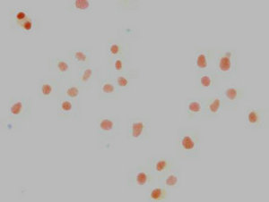 Immunocytochemistry analysis of CSB-MA888008A0m diluted at 1:100 and staining in Hela cells performed on a Leica BondTM system. The cells were fixed in 4% formaldehyde, permeabilized using 0.2% Triton X-100 and blocked with 10% normal goat serum 30min at RT. Then primary antibody (1% BSA) was incubated at 4°C overnight. The primary is detected by a biotinylated secondary antibody and visualized using an HRP conjugated SP system.