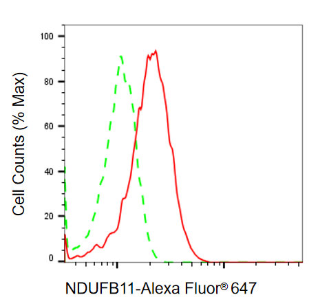 Flow cytometric analysis of NDUFB11 expression in HepG2 cells using NDUFB11 antibody. Green, isotype control; red, NDUFB11.