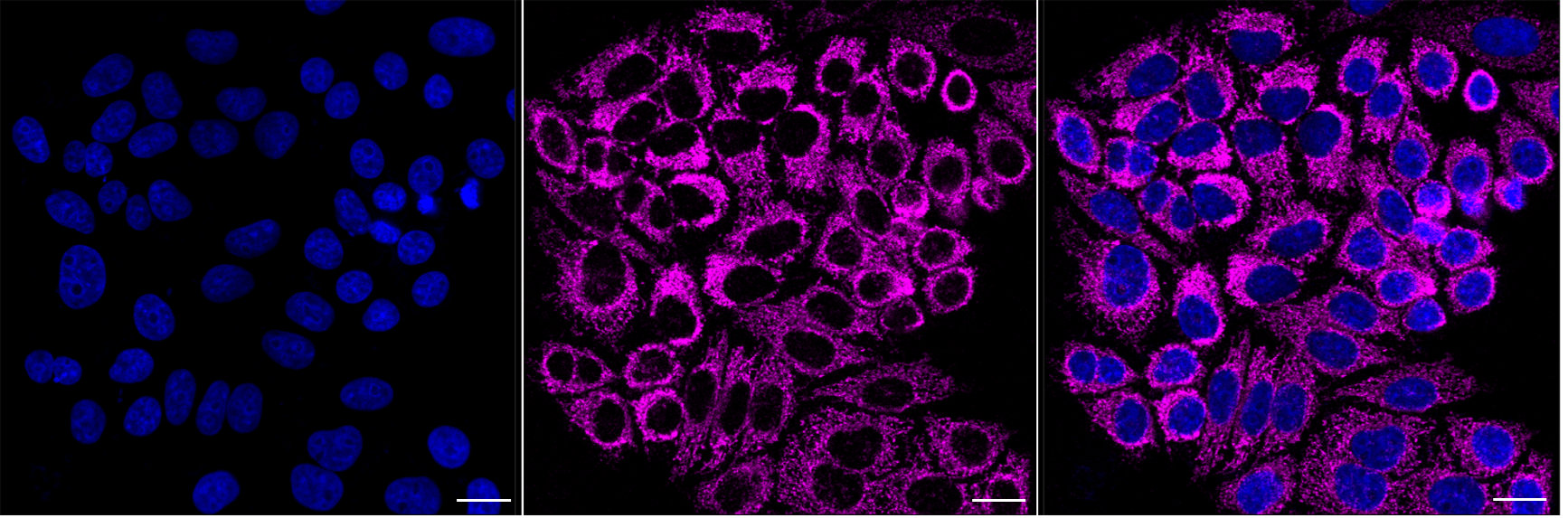Immunocytochemical staining of HepG2 cells with NDUFB11 antibody. Nuclei were stained blue with DAPI; NDUFB11 was stained magenta with Alexa Fluor? 647. Images were taken using Leica stellaris 5. Protein abundance based on laser Intensity and smart gain:Medium. Scale bar, 20 μm.