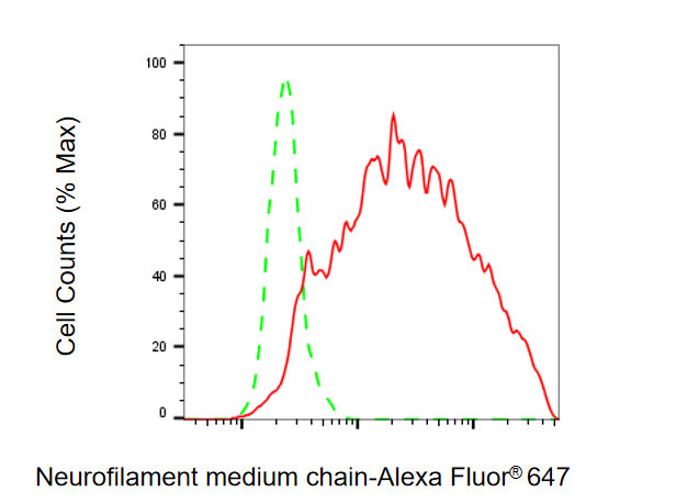 Flow cytometric analysis of Neurofilament medium chain expression in HeLa cells using Neurofilament medium chain antibody. Green, isotype control; red, Neurofilament medium chain.
