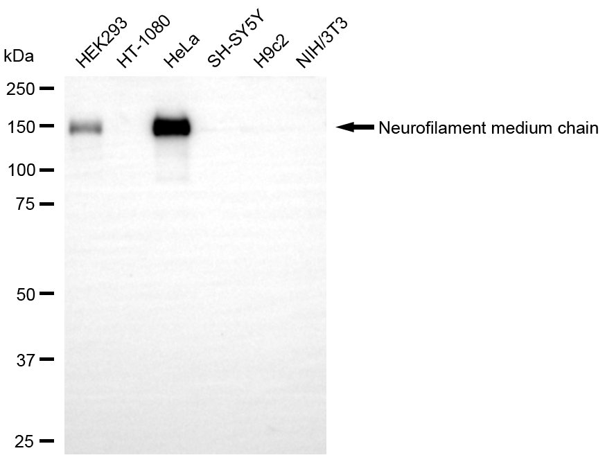 Western blotting analysis using neurofilament medium chain antibody. Total cell lysates (30 μg) from various cell lines were loaded and separated by SDS-PAGE. The blot was incubated with neurofilament medium chain antibody and HRP-conjugated goat anti-rabbit secondary antibody respectively.